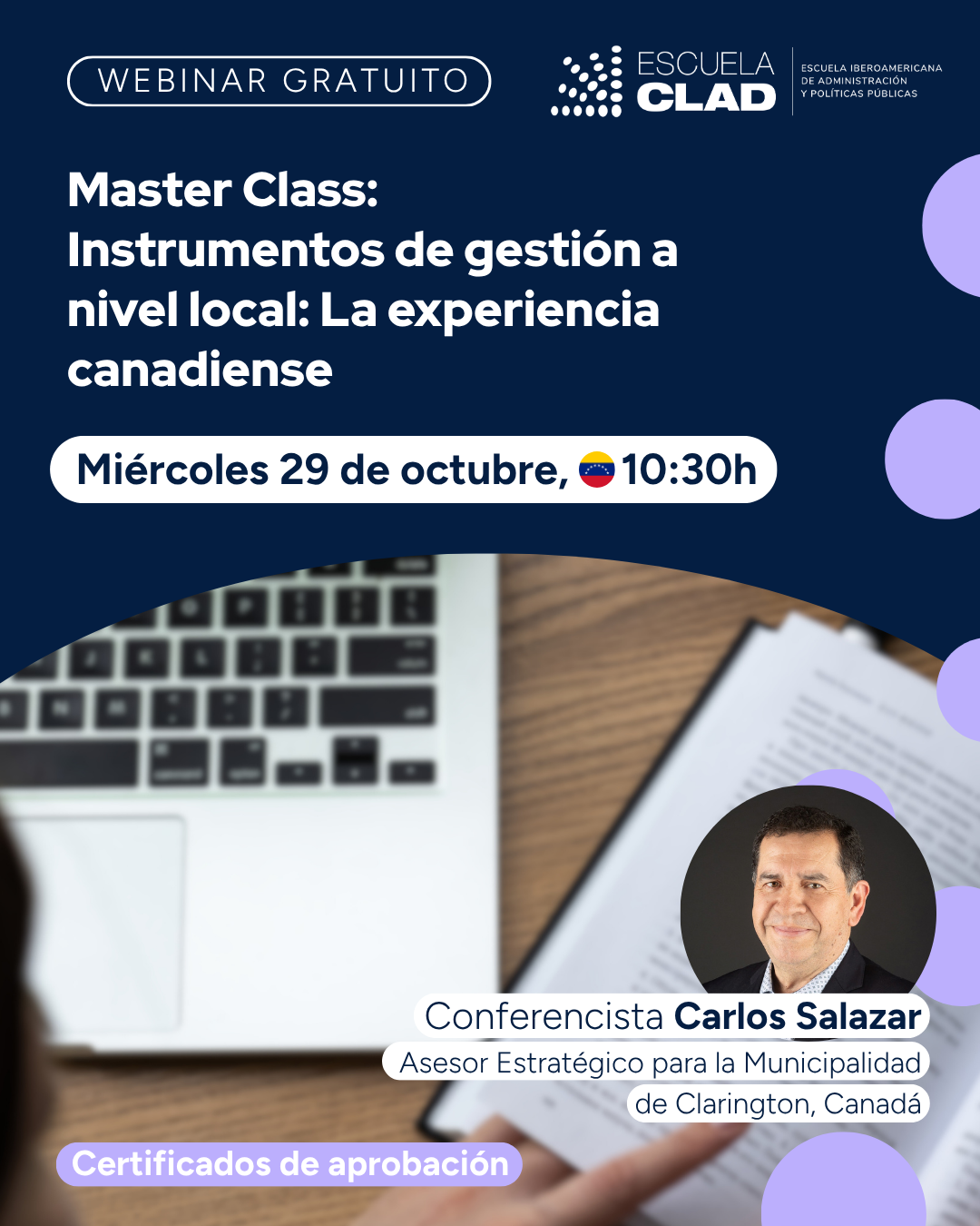 La Escuela del CLAD invita a registrarse a la Master Class “Instrumentos de Gestión a Nivel Local: La Experiencia Canadiense”, de la mano de Carlos Salazar, quien actualmente se desempeña como Asesor de Proyectos Estratégicos para la Municipalidad de Clarington, a realizarse en vivo el miércoles 29 de octubre, entre las 10.30 horas y las 12.00 horas (Venezuela), con opción de Certificado Escuela CLAD.