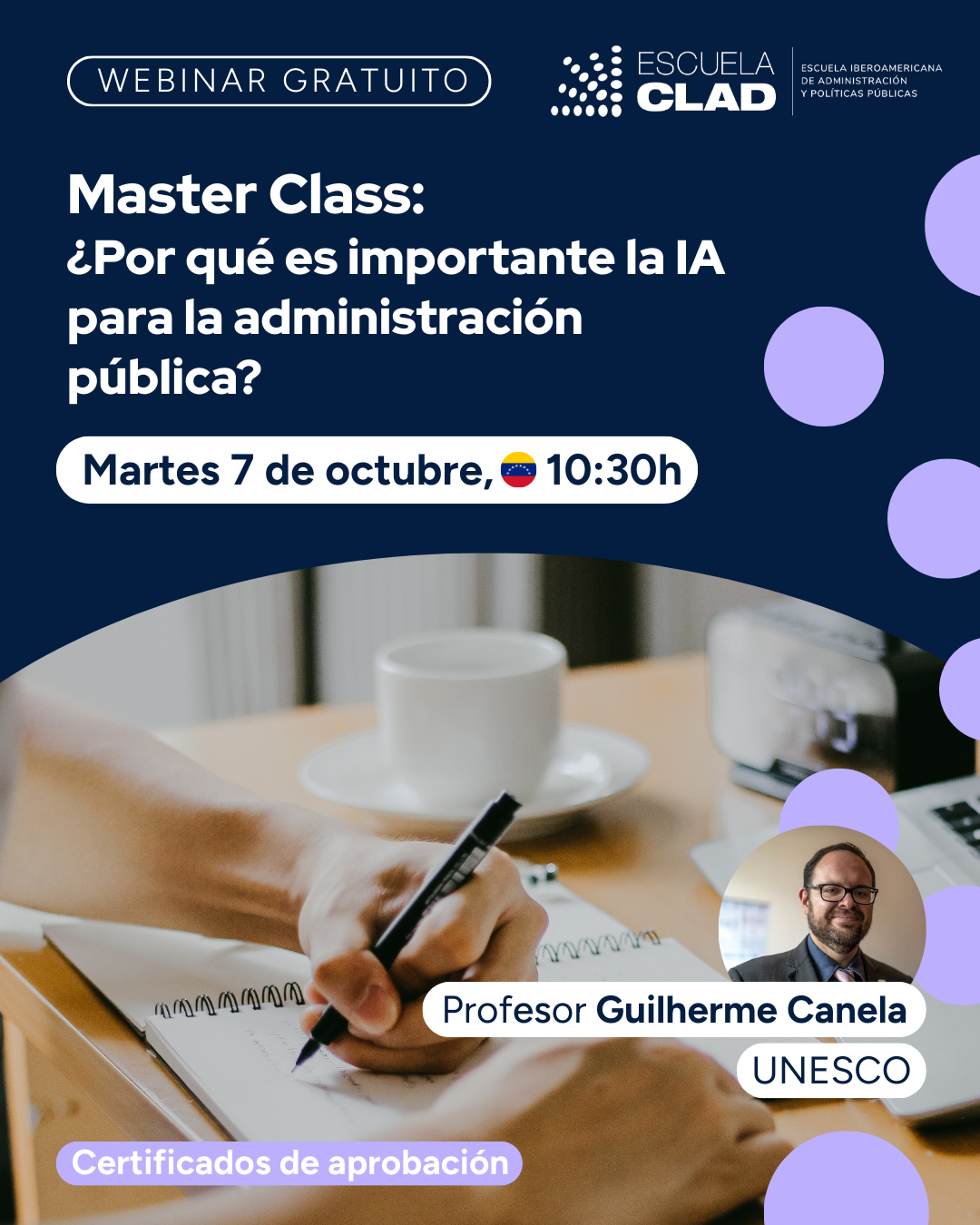 La Escuela del CLAD en alianza con UNESCO invita a registrarse a la Master Class "¿Por qué es importante la IA para la administración pública?", de la mano de Guilherme Canela, Director de la División de Inclusión y Políticas Digitales y Transformación Digital, Sector de Comunicación e Información de la UNESCO, a realizarse en vivo el martes 7 de octubre, entre las 10.30 horas y las 12.00 horas (Venezuela), con opción de Certificado Escuela CLAD.
